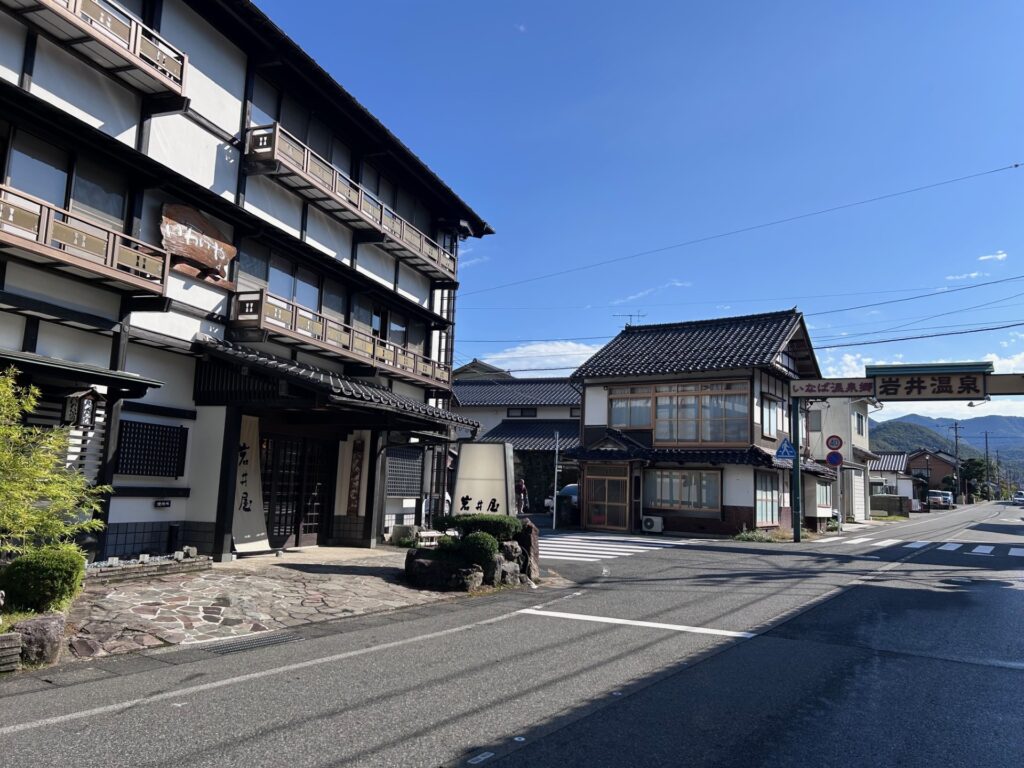 もっと山奥かあるいは海側に面した場所なのかなと勝手に思っていたのですが、普通に平地の田んぼを超えた街道の中に「ようこそ岩井温泉へ」を歓迎する看板が登場。