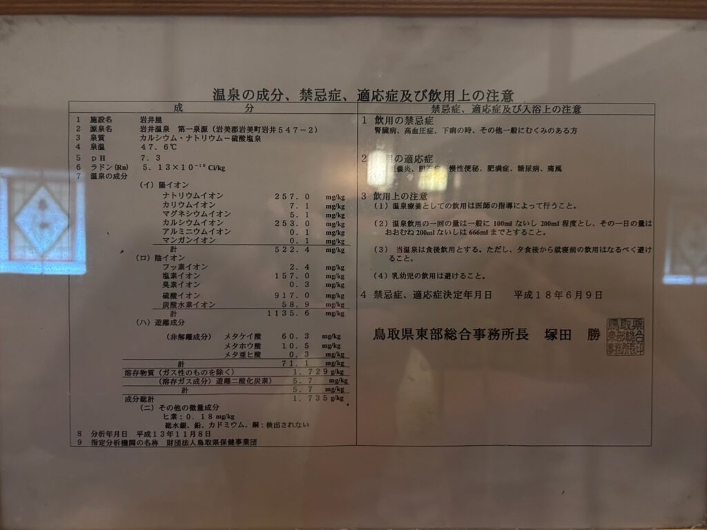 岩井温泉の泉質は「カルシウム・ナトリウム-硫酸塩泉」。泉温は約50℃で、自然湧出の源泉をそのまま使用しています。この泉質は、神経痛や関節痛、皮膚病、冷え性、ストレス性の不調などに効果があるとされ、まさに“癒しの湯”。