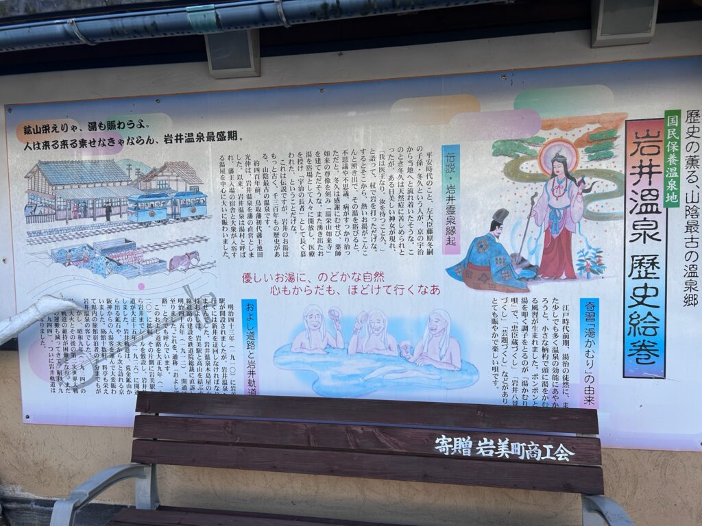 岩井温泉の開湯は平安時代、859年(貞観元年)と伝えられています。藤原冬久という貴族が皮膚病を癒すために旅をし、巫女の導きでこの地の湯を見出したという伝説が残るようです。